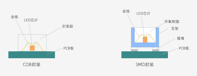 COB技術(shù),是將發(fā)光二級管芯片通過固晶超聲波焊接方式,用硅樹脂將晶元、引線直接封閉在電路板上,然后將LED直接安放在基底表面,熱處理至LED牢固地固定在基底為止,隨后再用絲焊的方法在LED和基底之間直接建立電氣連接,省去了SMD的燈珠封裝、貼片、回流焊等工藝,提升了器件的集成度和穩(wěn)定性。